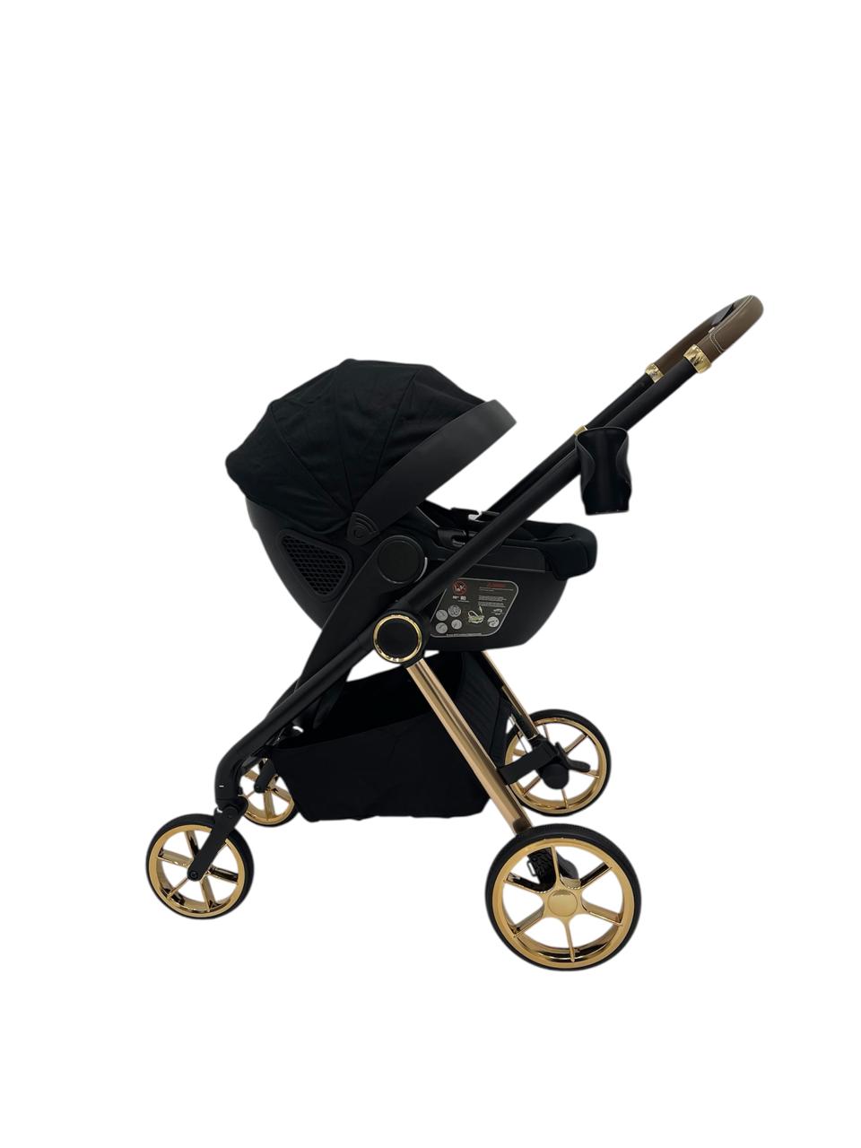 امنحي صغيركِ تجربة تنقّل مثالية مع هذه العربة الفاخرة التي تجمع بين التصميم العصري والمزايا الذكية، باللون الأسود الأنيق مع هيكل معدني ذهبي ولمسات جلدية راقية