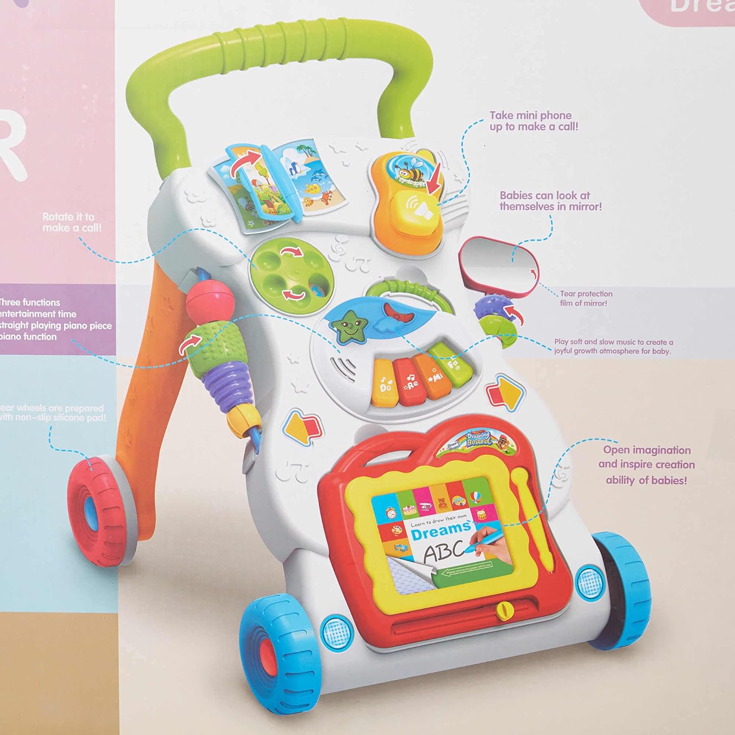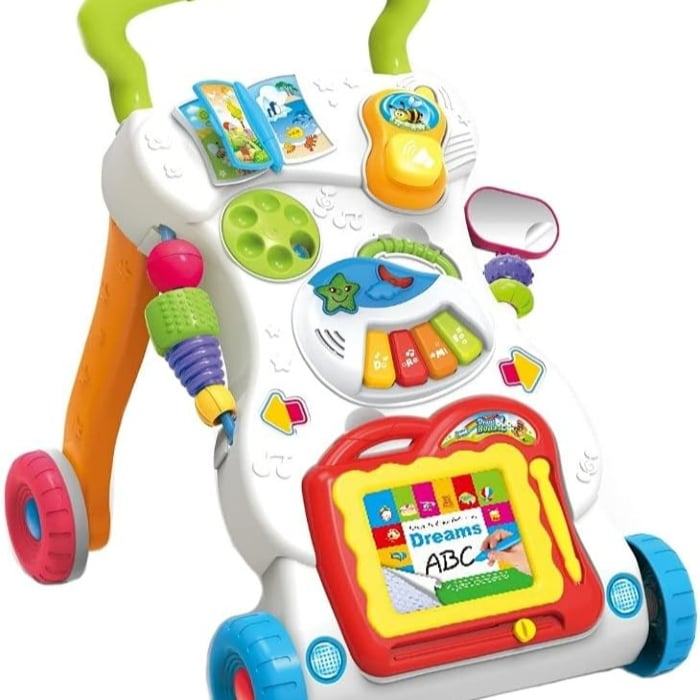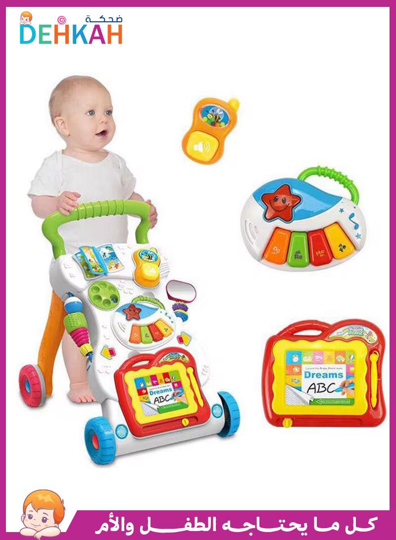 تساعد مشاية التعلم سيت تو ستاند طفلك على التطور من الزاحف إلى المشاية من خلال التكنولوجيا التكيفية. مع مجموعة من الأصدقاء المرحين لتشجيعه، سيحصل طفلك الصغير على متعة لا نهاية لها أثناء تعلمه المشي. ابدأ بلوحة الأنشطة سهلة الفصل للعب على الأرض أو المرح أثناء التنقل، ثم ارتق بالأمر مع المشاية الممتعة في المناورة. لوحة رسم، وجهاز إلكتروني، وكتاب صغير، وسماعة هاتف توفر متعة لا نهاية لها تحفز تعلم طفلك وتطور مهاراته الحركية. هذه المشاية قادرة على تدريب طفلك على السمع، والشعور باللمس، وإدراك الطفل للأشكال المختلفة، وتعلم المشي علمياً. تقدم المشاية طريقتين للعب: ادفعها على الأرض + الجلوس واللعب. يمكّنك البرغي القابل للتعديل من ضبط سرعتها وفقًا لوتيرة تعلم الطفل المشي، حتى يتمكن الطفل من تعلم المشي بطريقة أكثر أمانًا وعلمية. هيكل مثلث صلب، يمكن للمشاية مساعدة الطفل على الحفاظ على توازن الجسم لتشكيل وضعية المشي الصحيحة مزود بعجلات خلفية مطاطية خاصة لزيادة الاحتكاك بشكل كبير وعدم الانزلاق. تتميز الذراع بملمس غير منزلق، بحيث لن يسقط الطفل عندما يمسك بها مشاية موسيقية مصنوعة من مادة أكريلونتريل بوتادين ستايرين المستوردة وغير السامة والصديقة للبيئة