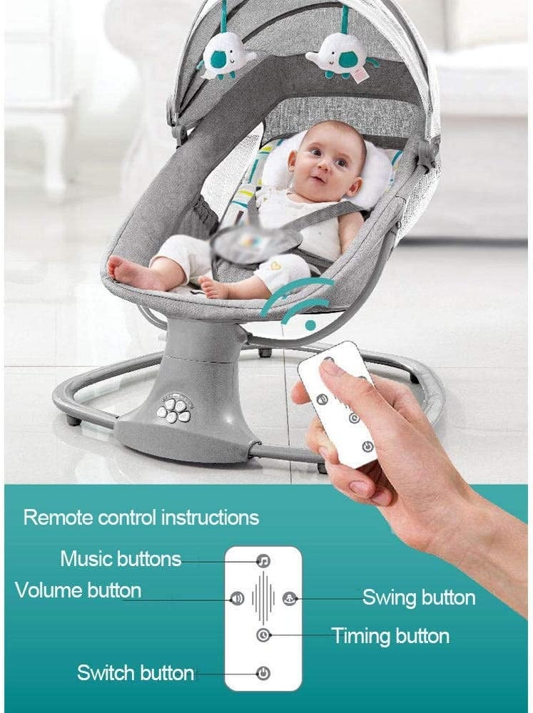 4. مزود بلوحة تحكم متكاملة لتعديل سرعة التأرجح، الموسيقى، ومستويات الصوت بسهولة. يأتي مع جهاز تحكم عن بعد لراحة الأهل.